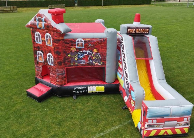 Pronájem skákacího hradu Hořící hasičský dům se skluzavkou 8m x 6,6m x 4m